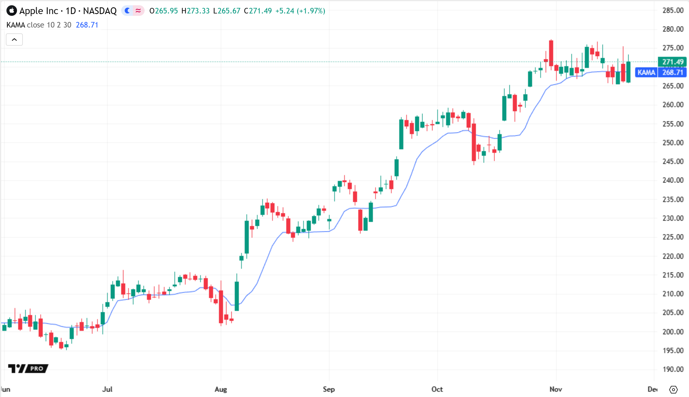 La Moyenne Mobile Adaptative de Kaufman (KAMA), introduite par Perry J. Kaufman en 1995, est une moyenne mobile qui ajuste dynamiquement son comportement de lissage en fonction du bruit relatif ou de l'instabilité des mouvements du marché.