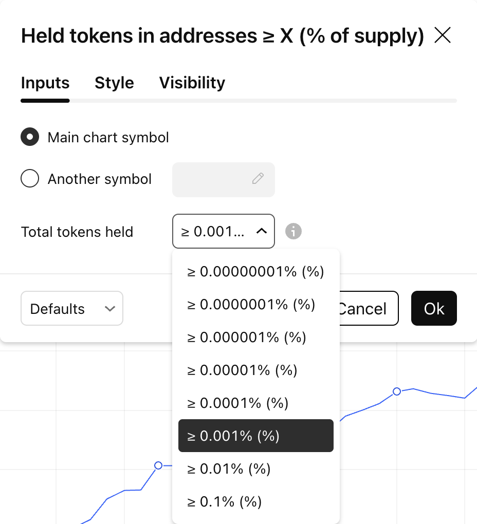 Le montant des tokens détenus dans les adresses ≥ X (% de l'offre) est calculé en additionnant les soldes des adresses où le solde est ≥ (Offre actuelle × X/100). Les utilisateurs peuvent ajuster le paramètre X dans les réglages de l'indicateur pour analyser la concentration de la richesse à différents seuils de pourcentage.