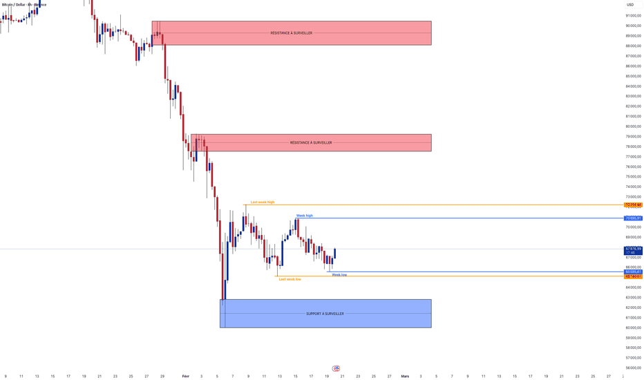 Depuis, le prix consolide au-dessus de 67.4k et travaille maintenant la zone 68.2k, ancienne résistance devenue support court terme. Tant que ce niveau est défendu, le biais devient neutre → haussier.