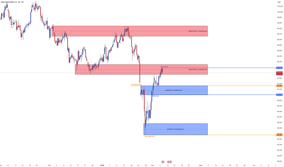 DXY | L’ANALYSE DU JOURAnalyse technique : Le DXY marque une pause stratégique ce vendredi matin, "bloqué" sous le plafond psychologique des 98.000. Ce rejet n'est pas une surprise : après une remontée quasi ininterrompue de 2% depuis les bas de janvier, le Dollar rencontre une résistance historique où les institutionnels